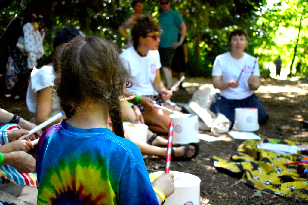 We had an extra helper this time, too. Our three-year old daughter handed out drumsticks, suggested new bucket drumming techniques, and informed everyone of the sound walk ‘rules’.